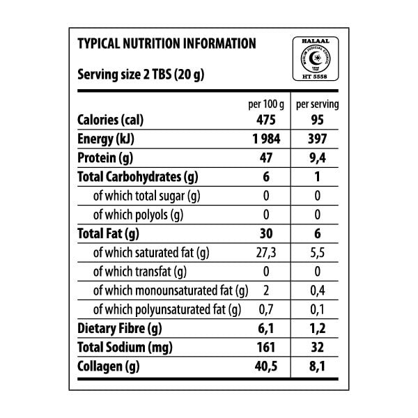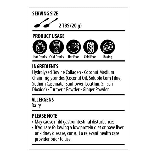 Hydrolysed bovine collagen, coconut medium chain triglycerides (coconut oil, soluble corn fibre, sodium casienate, sunflower lecithin, silicon dioxide), turmeric powder, ginger powder